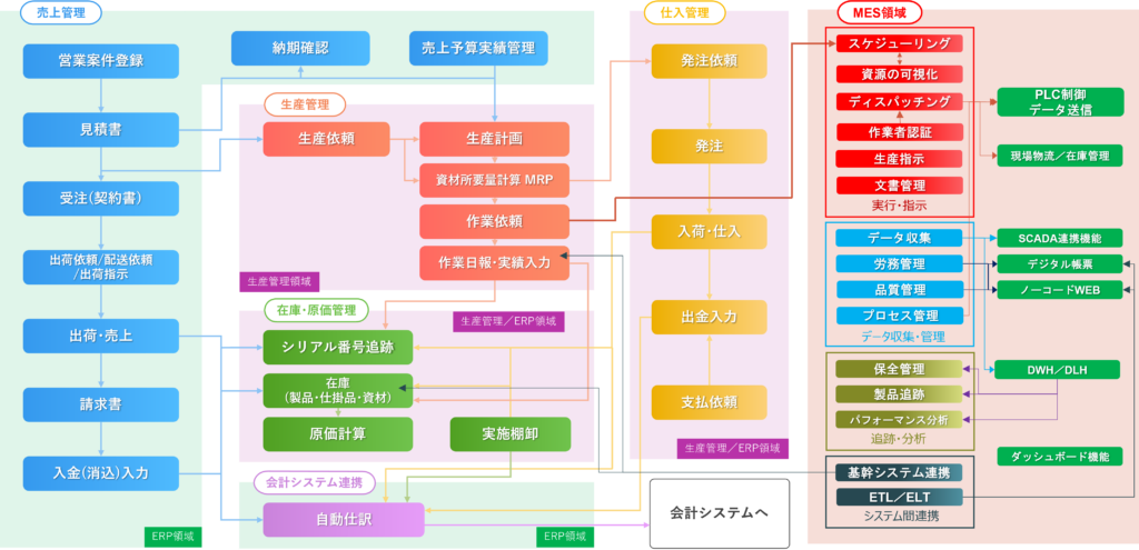 - 例えば、振動センサーが異常値を検知した瞬間、MES上でその設備のステータスを「故障中」に変更し、新たな製造オーダーの割当を自動的にブロックするなどの事例があげられます。