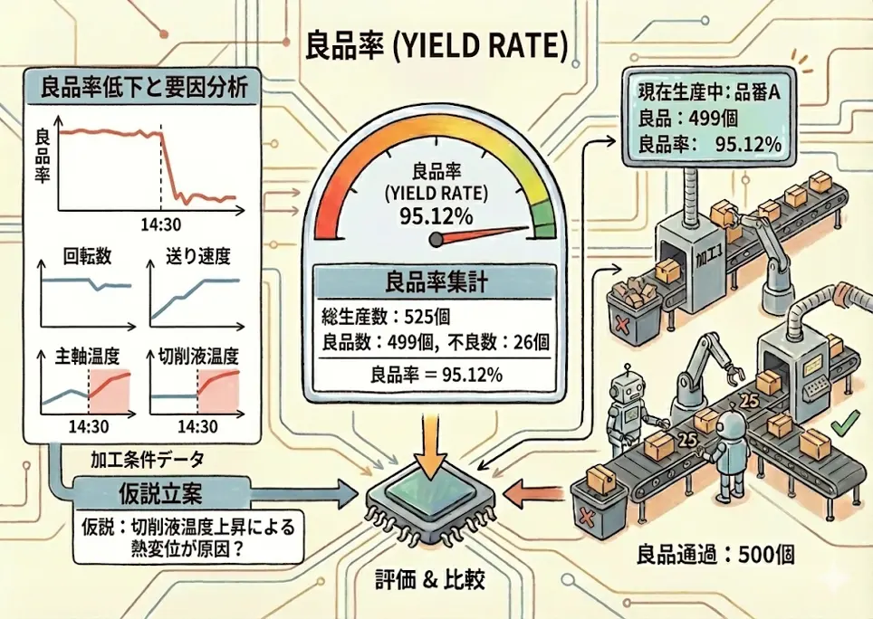 良品率とは、投入した原材料・部品に対する、最終的な良品の割合を指します。直行率(手戻り)とは異なり、良品率は「最終的に出荷できない廃棄品」をカウントするため、原価ロスに直結する指標です。