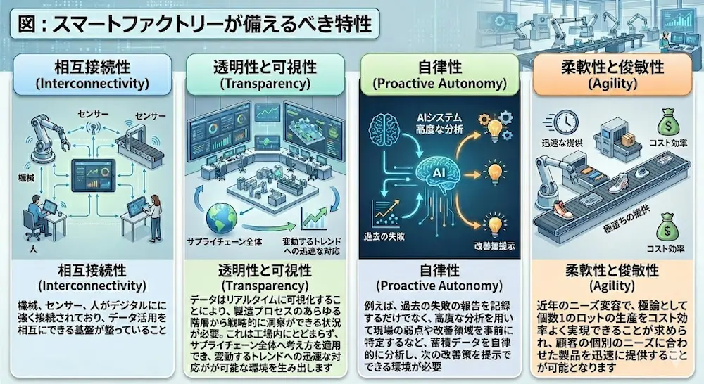 | データ (Data) | スマートファクトリーの血液。機械の稼働状況、品質測定値、環境データなどがリアルタイムで収集される基盤 |