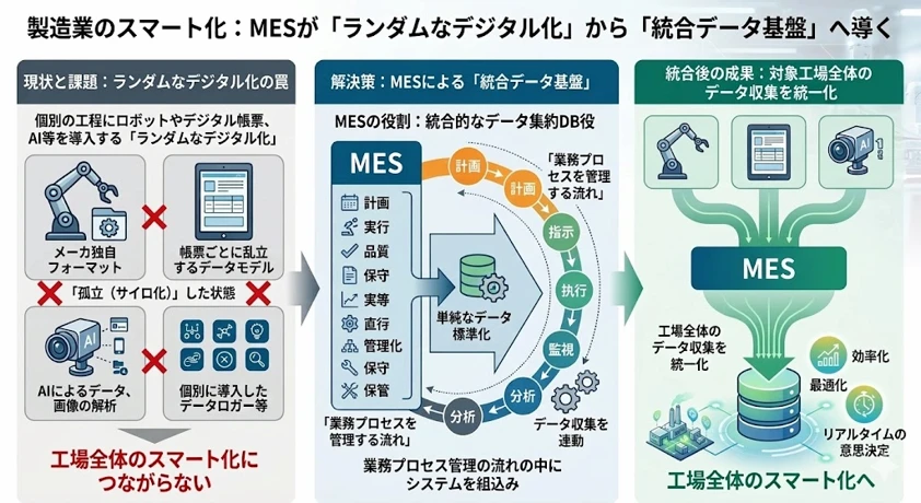 MESはこれを解決する「基盤」としての期待があり、MESの11機能だけにとどまらず「統合的なデータ集約DB役」を担う存在になりえます。これは単純に収集データを標準化するだけでなく、「業務プロセスを管理する流れ」の中でシステムを組込み、データ収集を連動させることで、対象工場全体のデータ収集の統一化を可能にします。