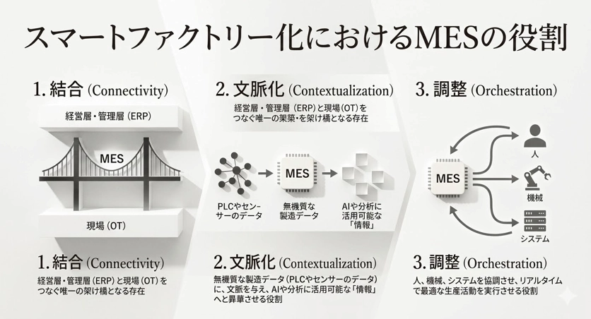 日本の製造業にとって、MESは「管理のためのコスト」ではなく、「競争力を生み出す源泉」として再定義されるべきであり、強固で柔軟なMES基盤の構築がスマートファクトリー化実現の重要なファクターとなることは間違いありません。