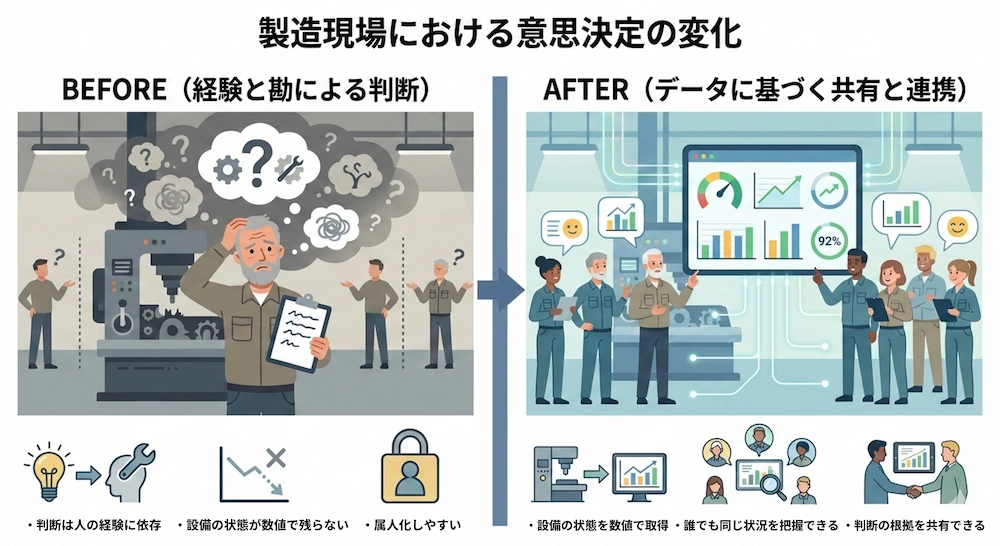ただ、こうした判断は、長年の経験を通じて身についたものであり、数値や手順として明確に表現されていないケースが多く見られます。そのため、改善や異常対応の背景にある考え方が、特定の担当者の中に留まり、十分に共有されていないことも少なくありません。