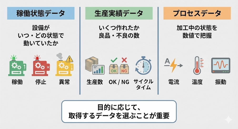 製造現場でのデータ取得にあたり、取得するデータ項目を大きく3つのカテゴリーに分類してご紹介します。